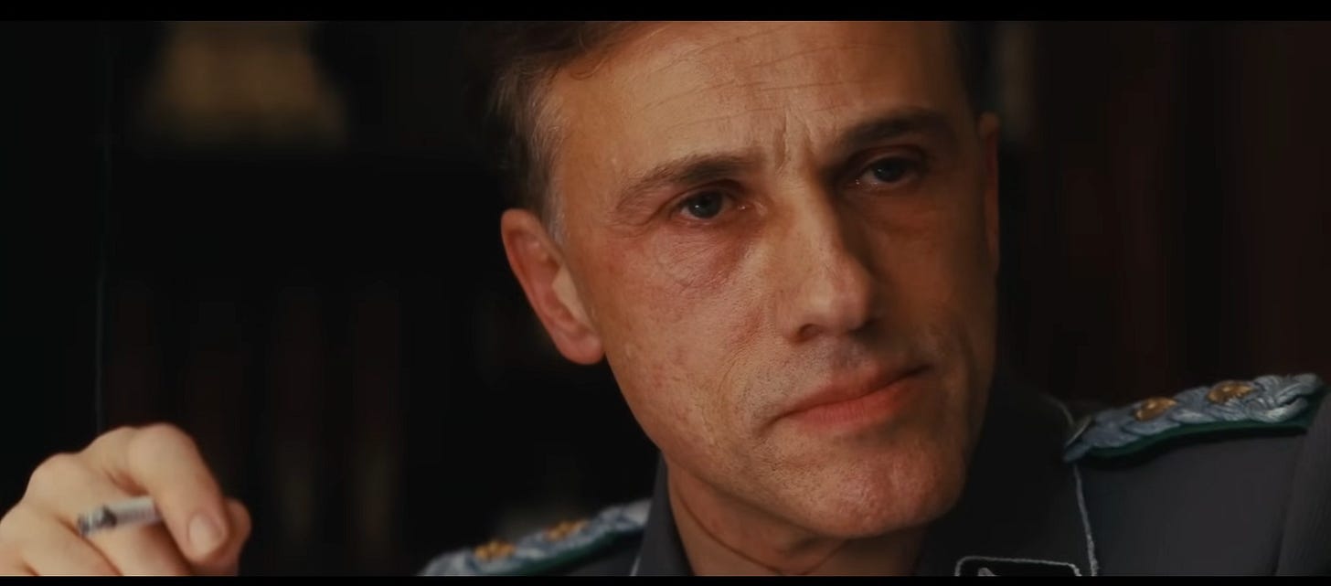 Shosanna come o strudel com elegância. Cada movimento calculado para não levantar suspeitas sobre sua farsa. Landa, por outro lado, ataca o prato com uma mão apenas, quebrando o alimento com o garfo e comendo sem a devida etiqueta. Ele pode ignorar todas as regras (as sociais, as religiosas, as morais) justamente porque está acima delas. O poder dá acesso à deselegância consentida em sociedade.