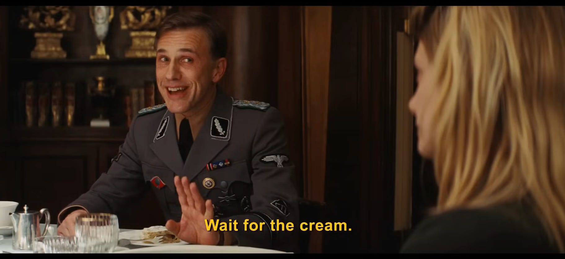 Hans Landa convida Shosanna para sentar à mesa. Pede um strudel com creme.
